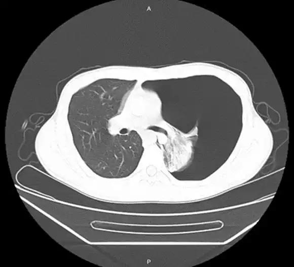 X-quang ngực và cắt lớp vi tính (CLVT) tại thời điểm nhập viện: Ghi nhận hình ảnh tràn khí màng phổi trái lượng nhiều, gây xẹp nhu mô phổi trái và đẩy lệch trung thất sang bên đối diện.